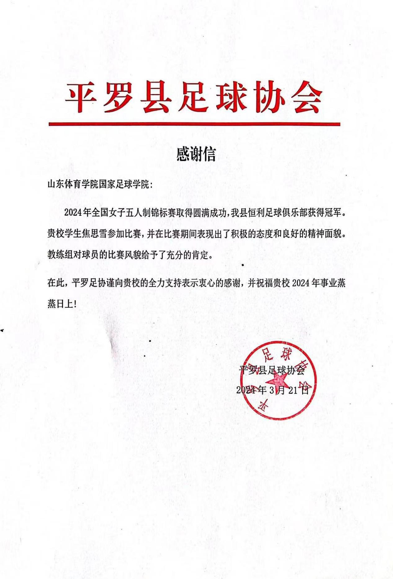 近日,2024全国女子五人制足球锦标赛在宁夏回族自治区平罗县举行,国家足球学院2023级5班学生焦思雪作为主力队员助力平罗恒利女足勇夺冠军,达到运动健将成绩标准,为球队创造了宁夏足球在全国比赛中的最佳战绩。