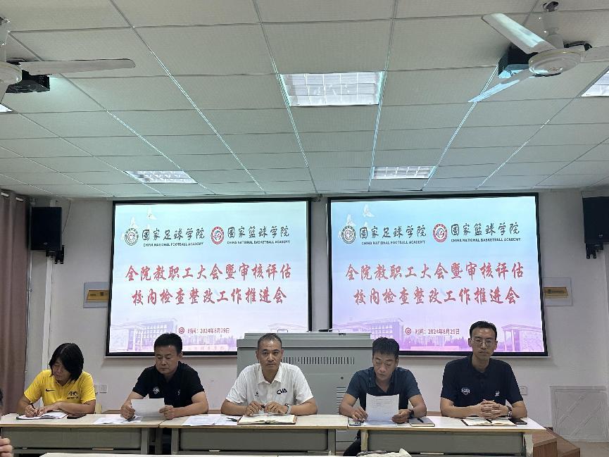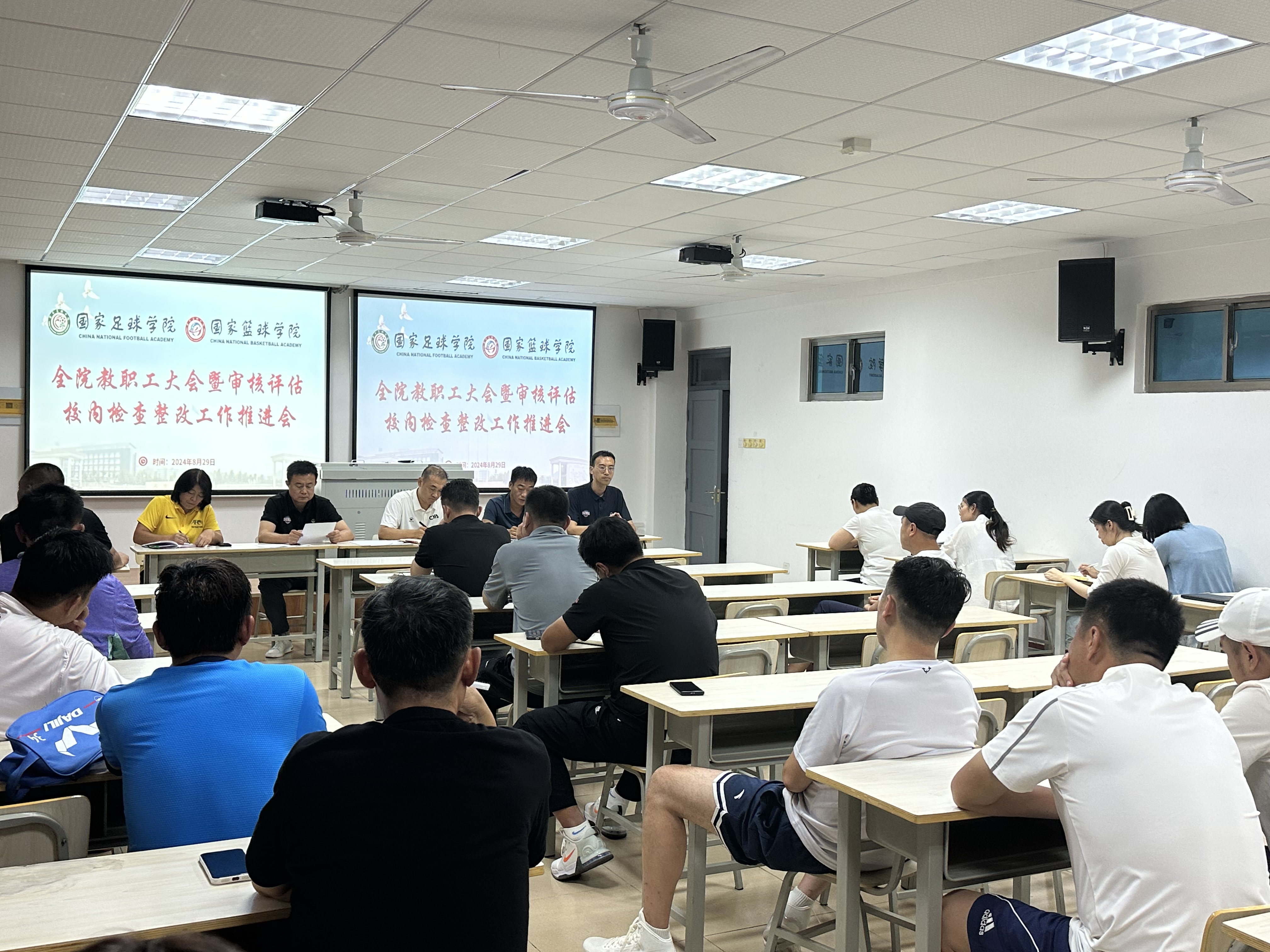 为深入推进学院本科教育教学审核评估整改工作,8月29日晚,国家足球学院国家篮球学院(以下简称“国家两院”)全院教职工大会暨审核评估校内检查整改工作推进会在培训楼314召开。学院领导班子和全体教职工参会。山东体育学院青岛校区管委会(筹)主任、国家两院副院长(主持日常工作)杜韬主持会议,学院领导班子和全体教职工参加会议。