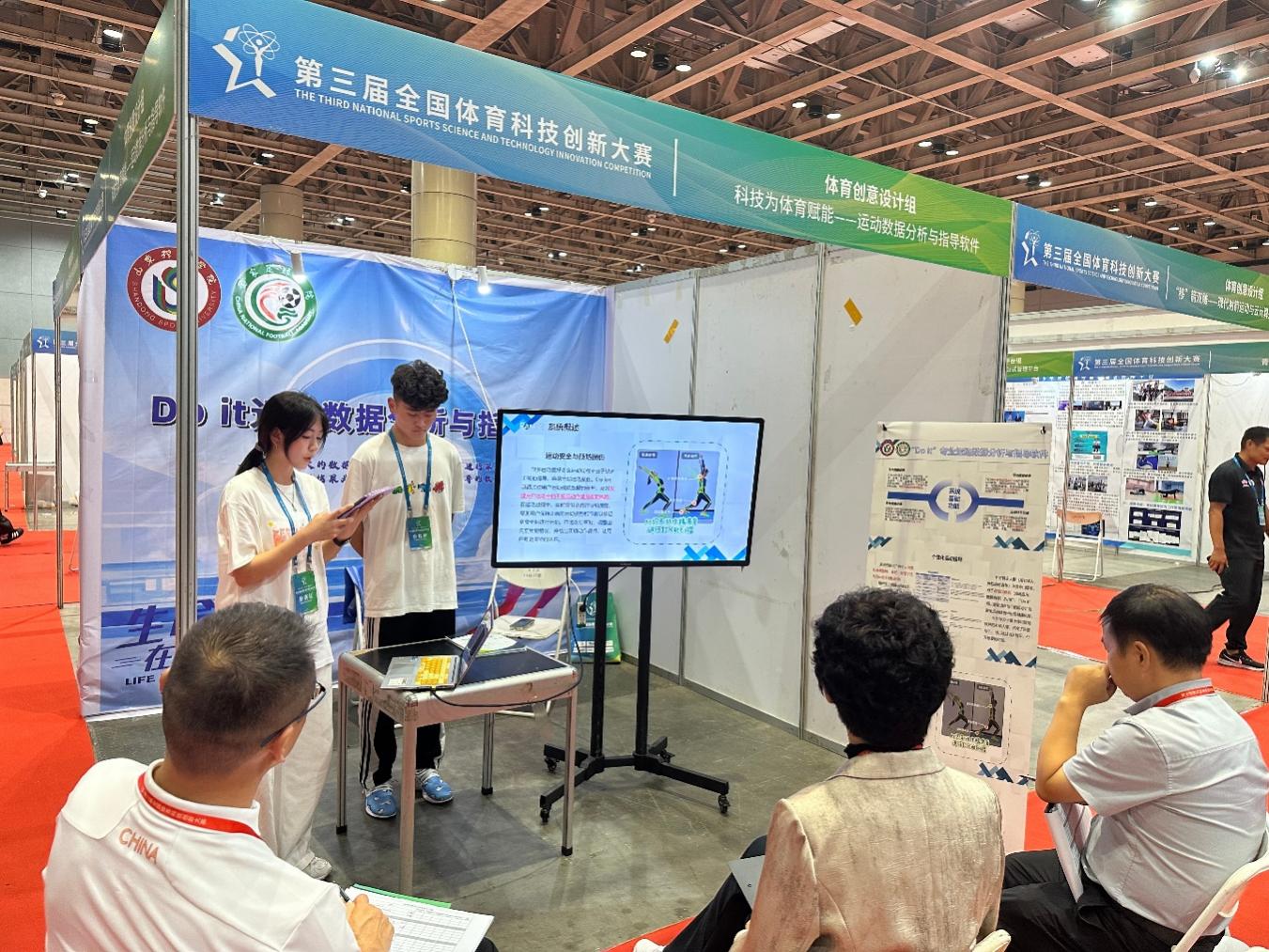 本届大赛以“科技创新助力体育强国建设”为主题,大赛征集范围涵盖体育产业11个大类的科技创新作品,设有学生体育科技创新组、体育软件平台组、体育产品展示组、体育创意设计组四个组别。学院4名教师带队,带领13名学生组成8个团队参加了3个组别的角逐。在项目路演和答辩环节,每一支参赛团队都展现出了饱满的热情和从容的风采,详尽阐述了各自作品的设计理念,凸显了作品的科技性、创新性和智慧性,打动了评委与现场观众,充分展现了学院优秀的专业水平和综合素质。