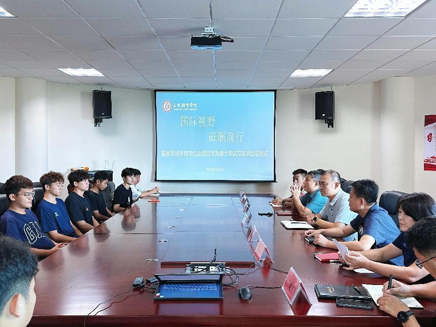 9月5日上午,国家足球学院国家篮球学院(以下简称“国家两院”)2024年学生赴西班牙武康大学实习实训出征仪式在培训楼4楼会议室举行。山东体育学院党委委员、副院长、日照校区管委会主任张疆之出席仪式并讲话,学院领导班子、足球教研室主任及学生参加活动。仪式由山东体育学院青岛校区管委会(筹)主任、国家两院副院长(主持日常工作)杜韬主持。