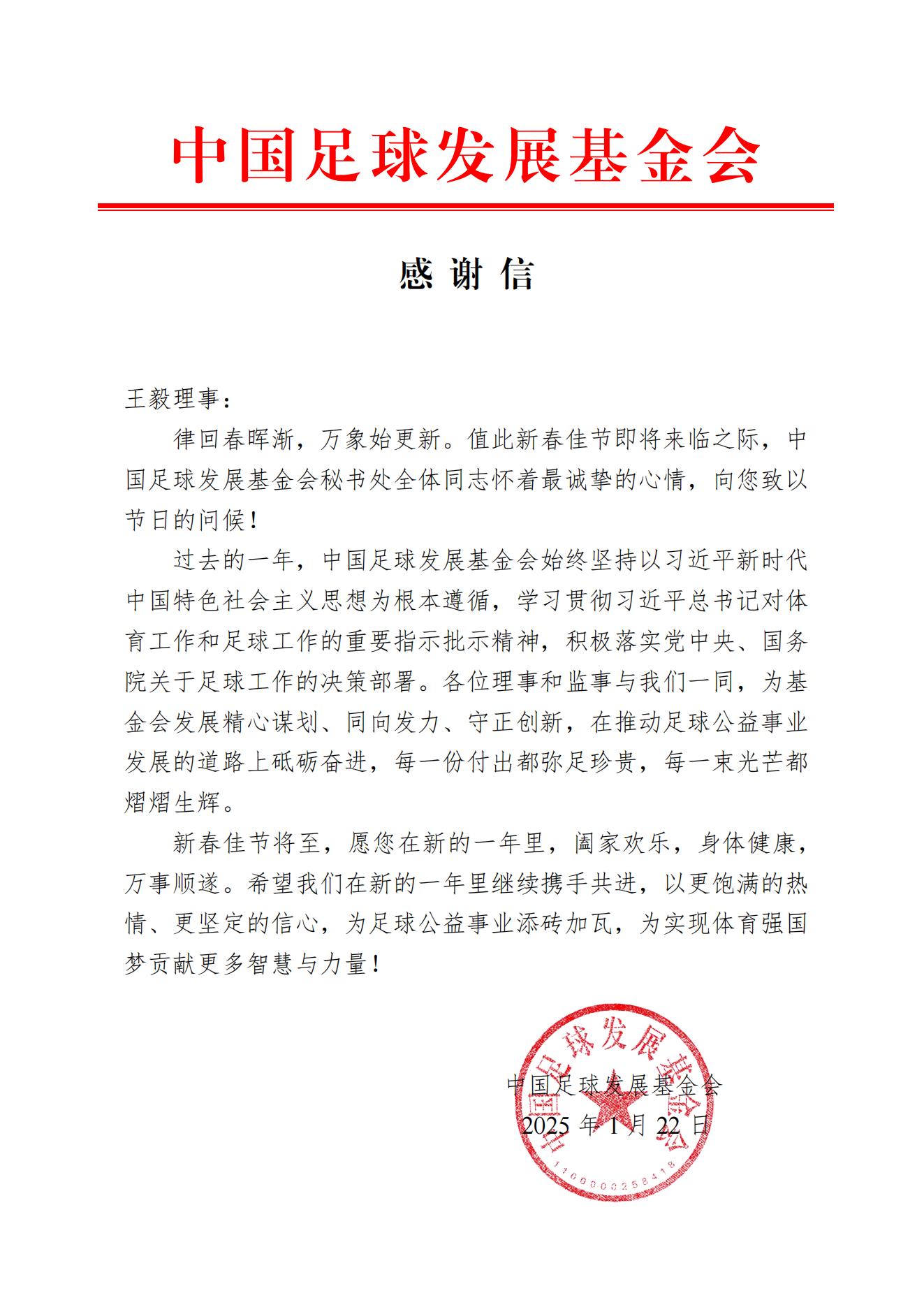 中国足球发展基金会向王毅书记发来感谢信 发布日期:2025-01-28 13:52  点击: