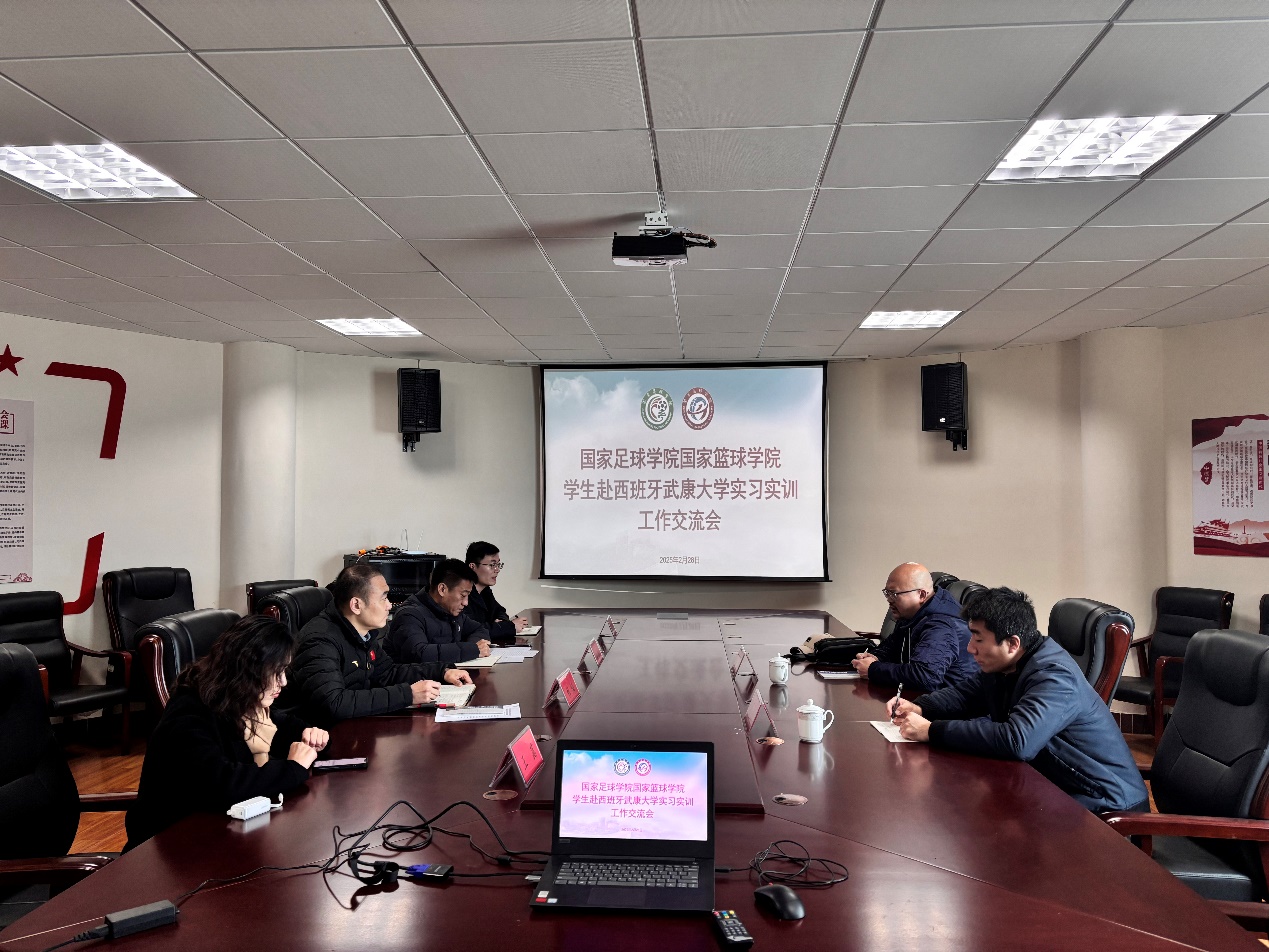 2月28日上午,国家足球学院国家篮球学院学生赴西班牙武康大学实习实训工作交流会在培训楼四楼会议室举行。西班牙武康大学UCAM项目部亚洲区负责人孙伟、驻华代表夏杰,山东体育学院青岛校区管委会(筹)主任、国家两院副院长(主持日常工作)杜韬,国家两院党总支副书记潘冰、党委院长办公室外事办副科级干部王菡、国家两院学生辅导员刘海泽参加会议。会议由潘冰主持。