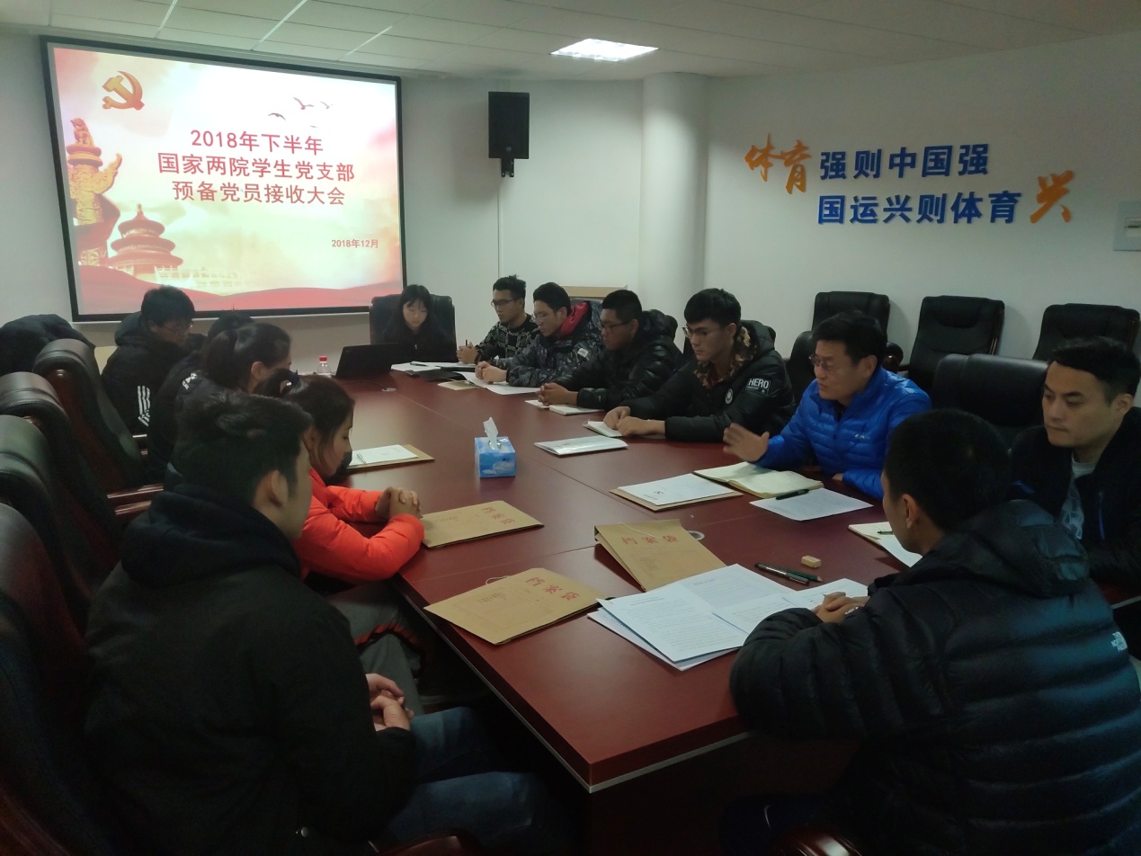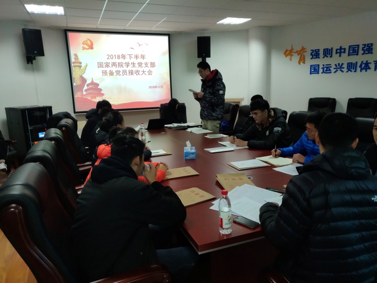 为响应党的号召,培养优秀党员,12月5日,中共山东体育学院国家足球学院国家篮球学院总支委员会学生支部在培训楼三楼会议室召开了党支部预备党员接收大会。本次会议由学生党支部书记任帅钦主持。大会严格按照议程,围绕接收2018年下半年5名新发展对象成为预备党员展开。