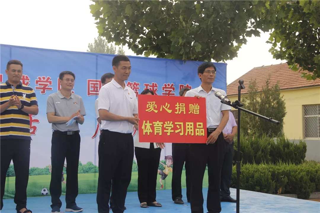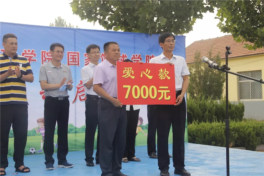 山东体育学院国家足球学院国家篮球学院暑期三下乡社会实践队指导老师任帅钦代表实践队为赵奎元小学捐赠物资