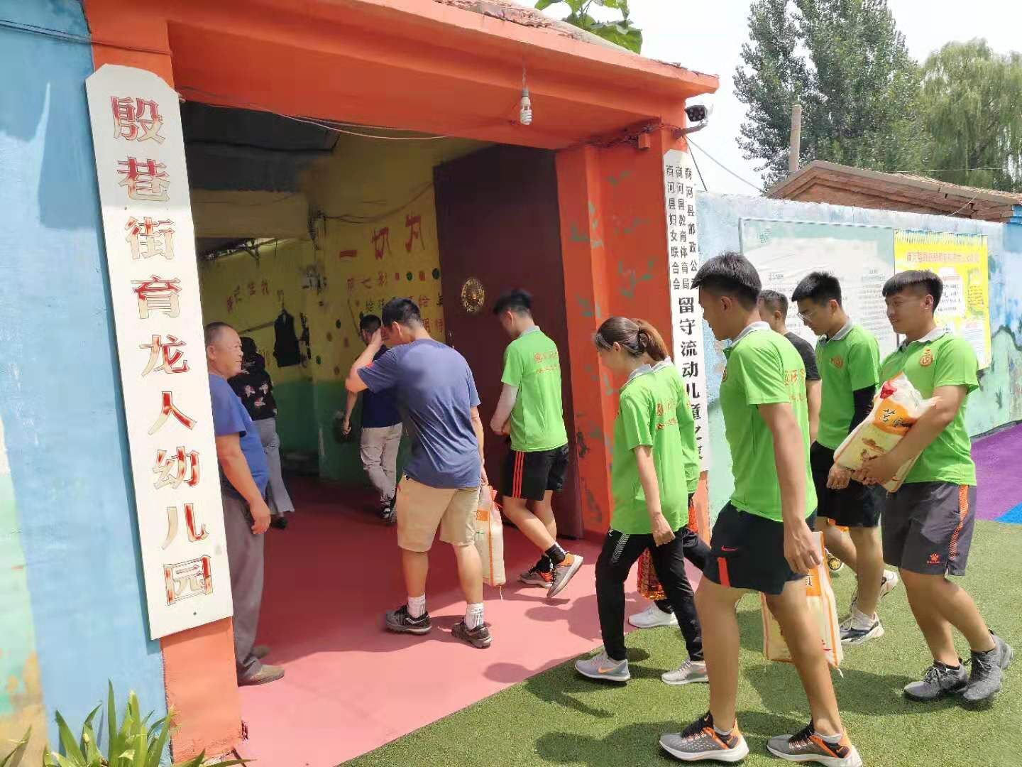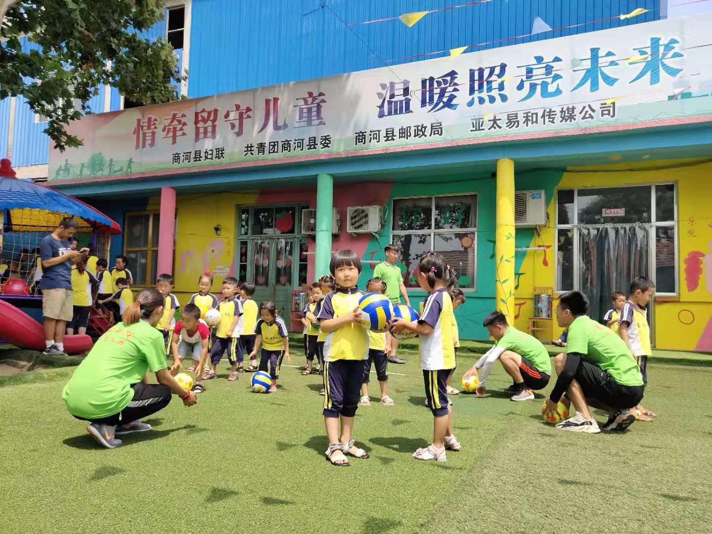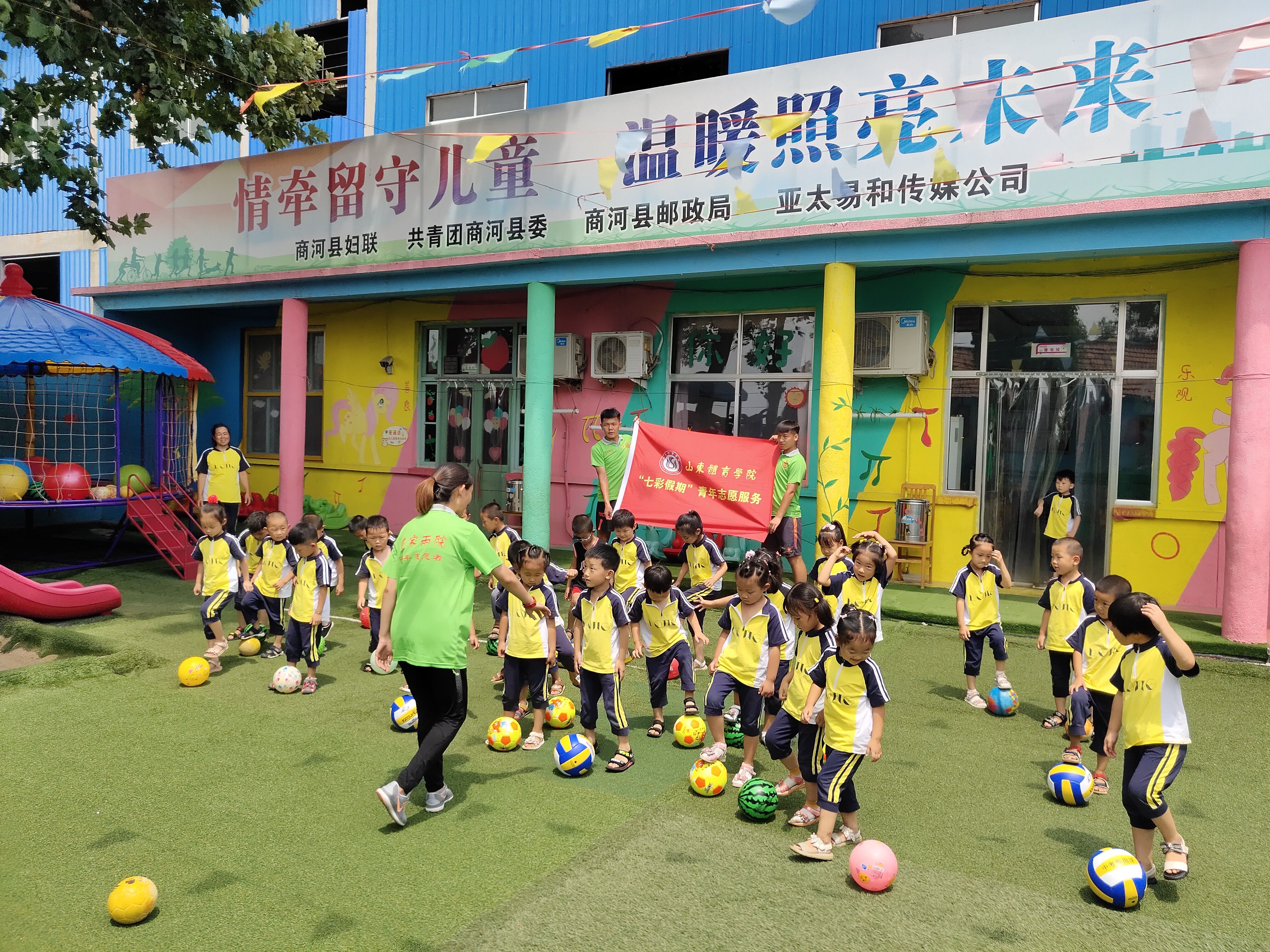 山东体育学院“梦与心源,夏乡之源”志愿服务队与殷巷镇留守流动儿童之家育龙人幼儿园。和幼儿园的小朋友进行互动,传授足球知识,并送去慰问品。
