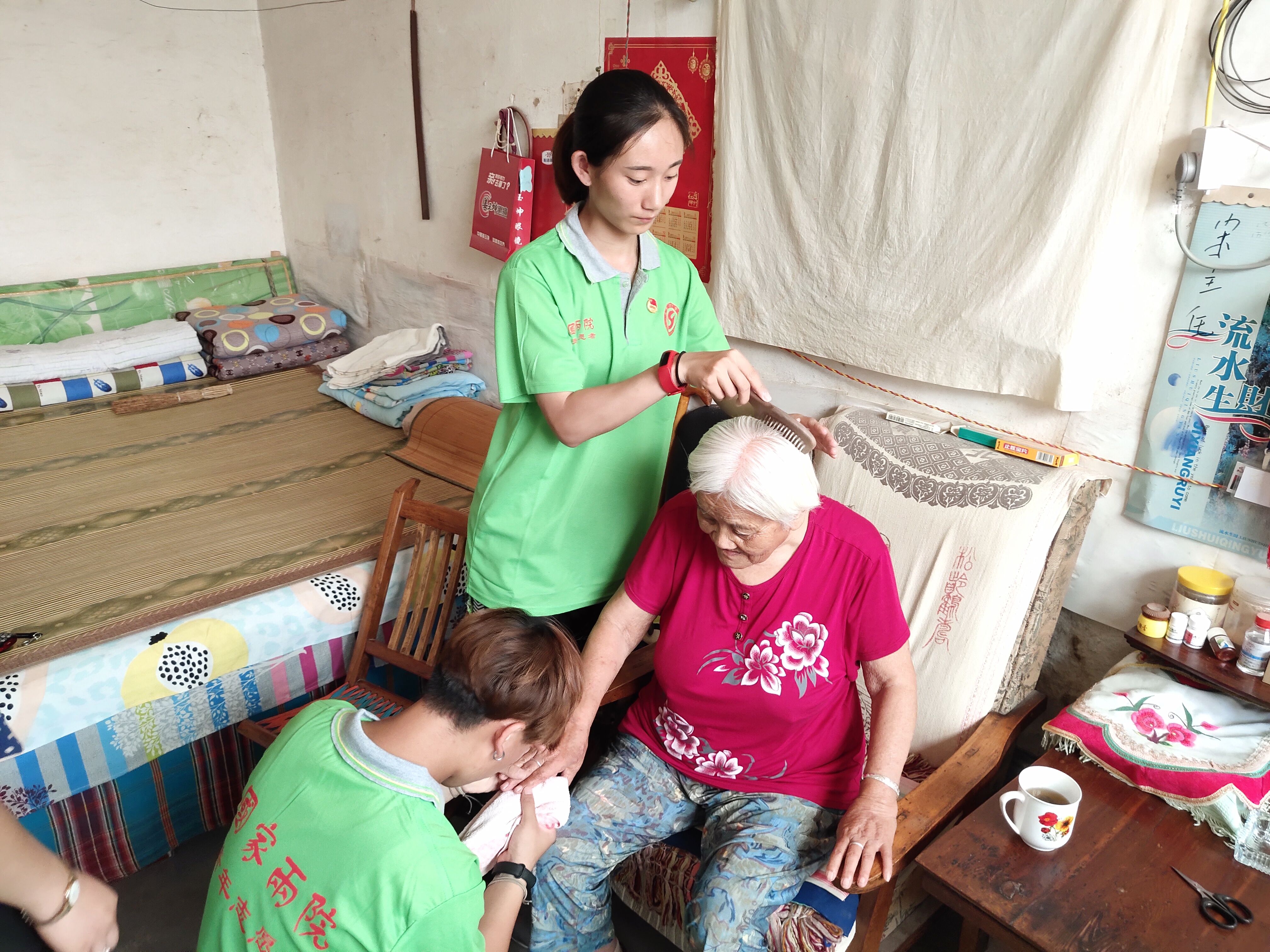 山东体育学院“梦与心源夏乡之源”志愿服务队帮助孤寡老人、贫困户打扫卫生。