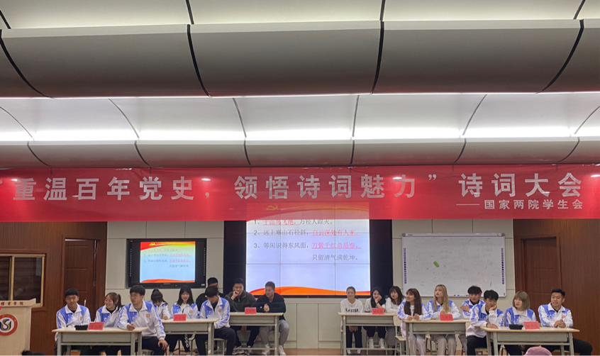 ?4月22日下午,国家两院团总支举办了“重温百年党史,领悟诗词魅力”诗词大会。国家两院党总支书记靳道强、综合部部长兼党总支副书记张凉、团总支负责人宋耀杰老师以及学生会全体成员参加了此次活动。