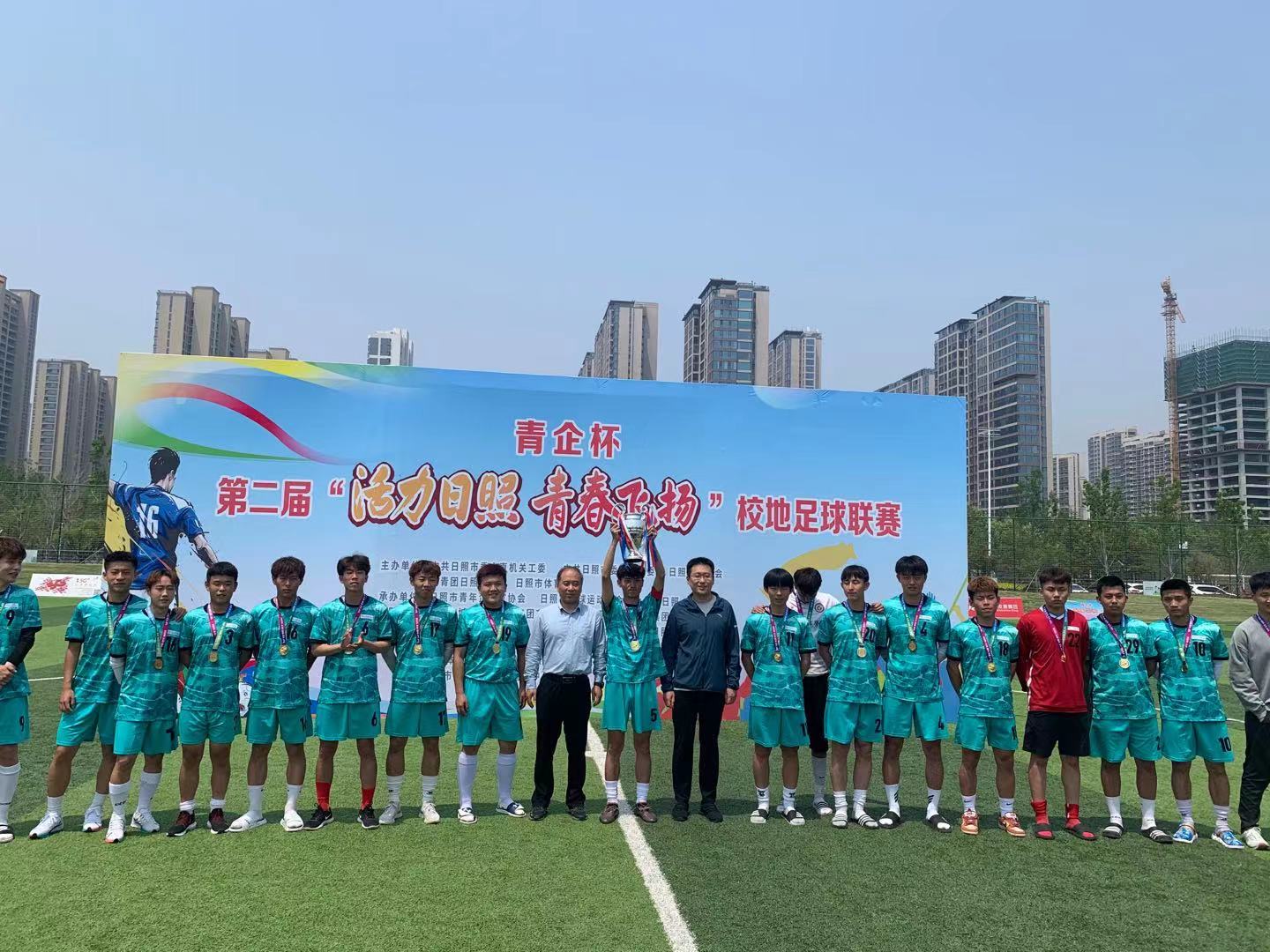 青春活力激情无限,不败战绩续写辉煌。5月22日,“青企杯”第二届“活力日照·青春飞扬”校地足球联赛圆满落下帷幕。学院足球队应邀参赛,最终以3:0战胜日照职业技术学院队,以不败的战绩蝉联校园组冠军。其中,尚泽宇、贺亚峰、王裕堃分别以6粒精彩进球荣获最佳射手称号。