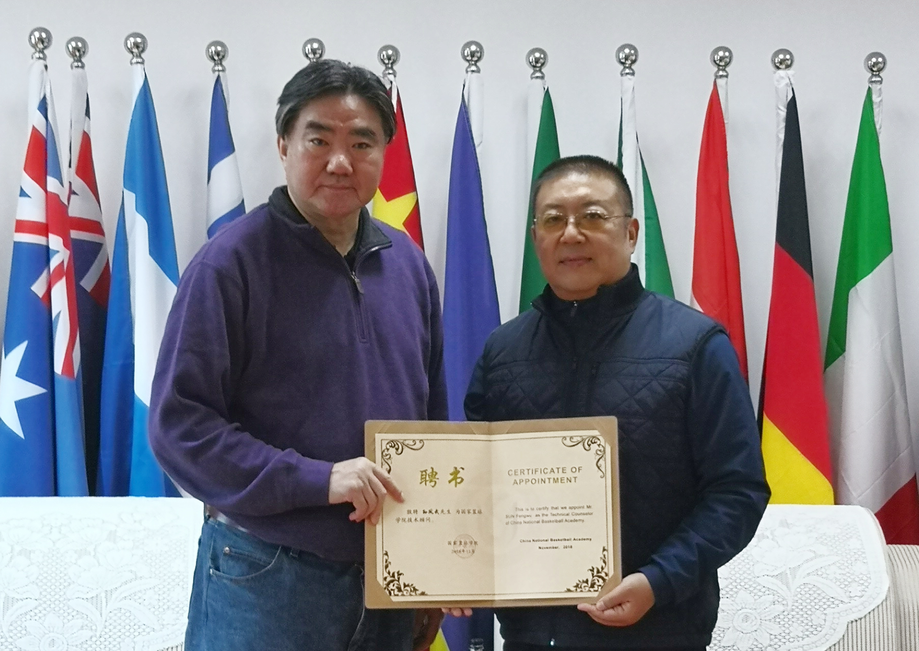 11月5日,前国家男篮队长、国家女篮主教练孙凤武受聘担任国家篮球学院技术顾问。山东体育学院党委书记、国家篮球学院院长王毅为孙凤武颁发了聘书。聘任仪式在山东体育学院国家篮球学院举行。亚篮联主席、原国家体育总局篮球运动管理中心主任、国家篮球学院顾问信兰成,山东体育学院副院长、日照校区管委会主任、国家篮球学院常务副院长谷忠德,国家篮球学院副院长连增威等出席仪式。仪式由山东体育学院日照校区办公室主任杜韬主持。