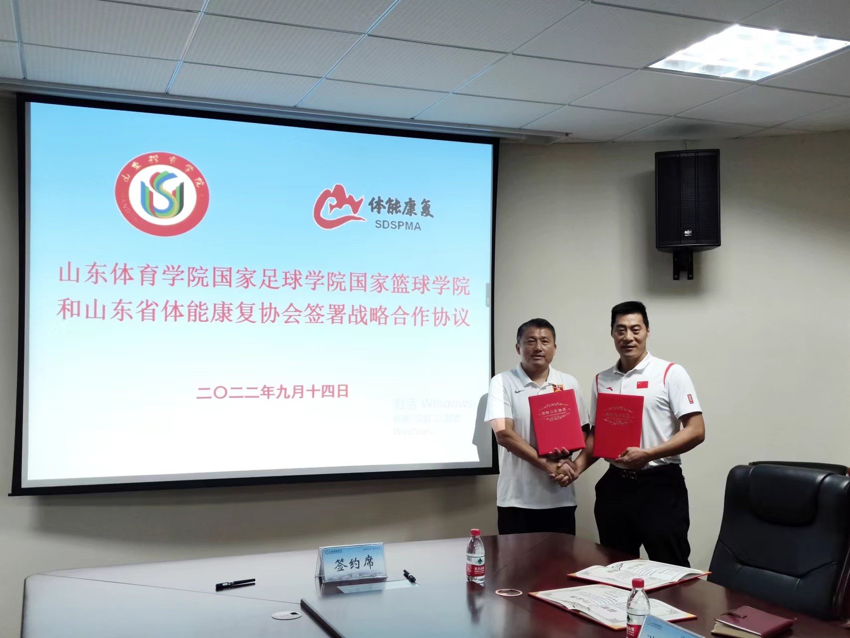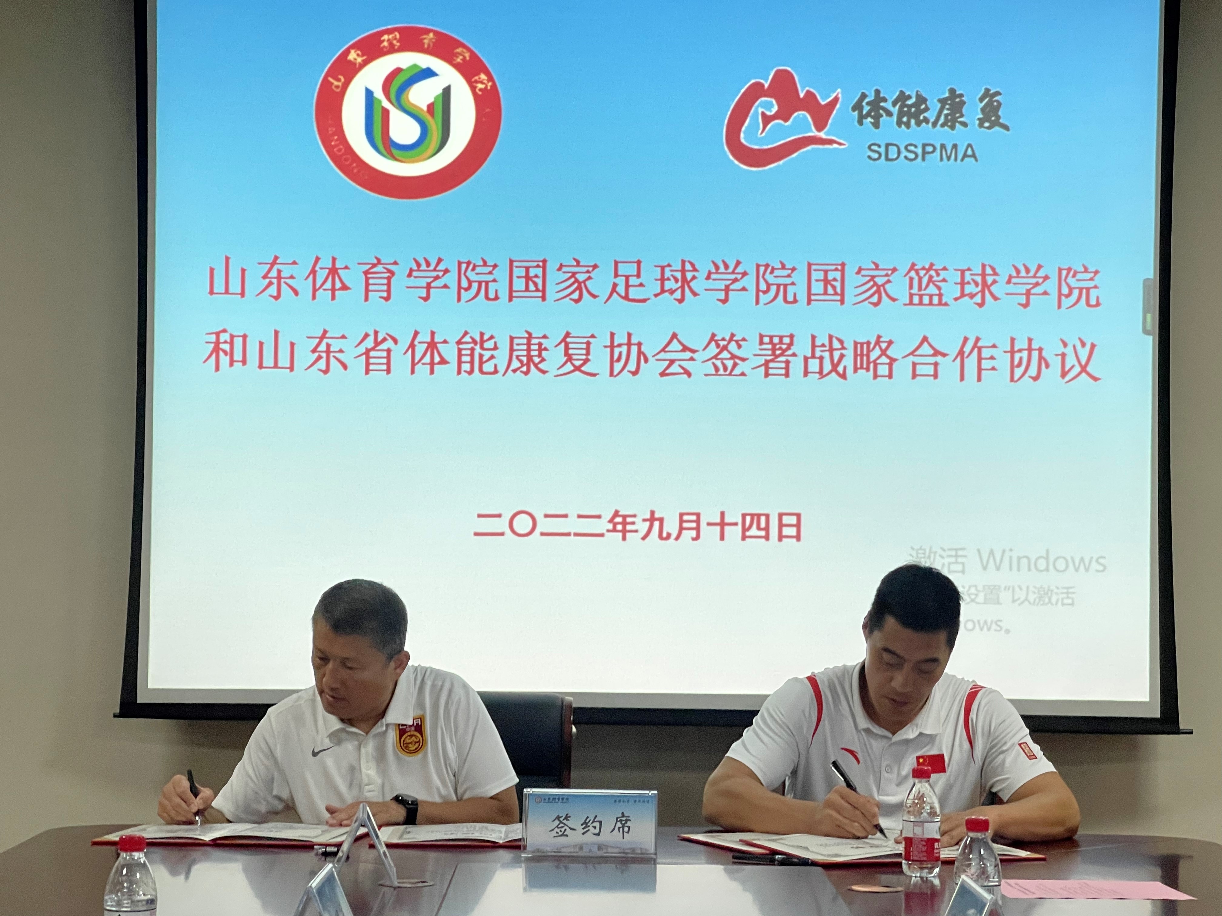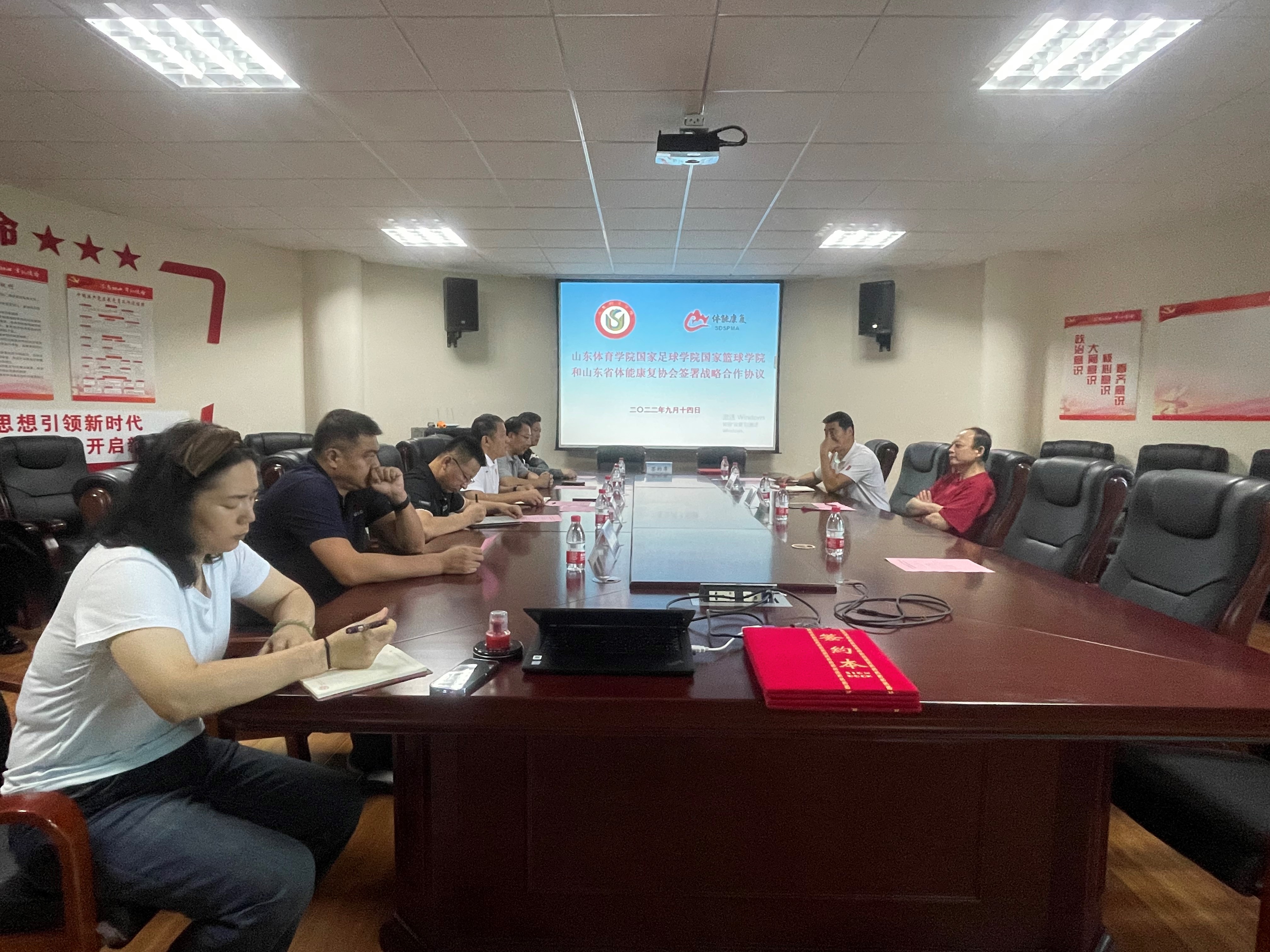 9月14日,国家足球学院国家篮球学院(以下简称“国家两院”)与山东省体能康复协会战略合作协议签约仪式在日照校区培训楼四楼会议室举行。山东体育学院副院长、日照校区管委会主任、国家两院副院长(主持日常工作)张疆之,山东省体育局备战办迟荣国主任,山东省体能康复协会秘书长张康,国家两院党总支书记单涛出席活动,签约仪式由国家两院业务部副主任曲国洋主持。