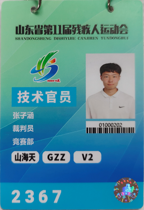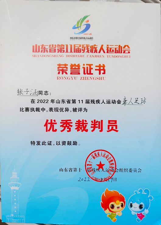 张子涵,足球国家二级裁判,国家两院2021级学生,担任本届省残运会聋人足球比赛裁判员,被评为“优秀裁判员”。