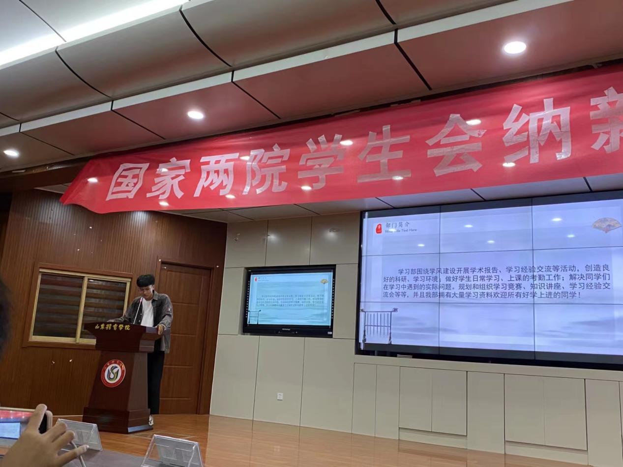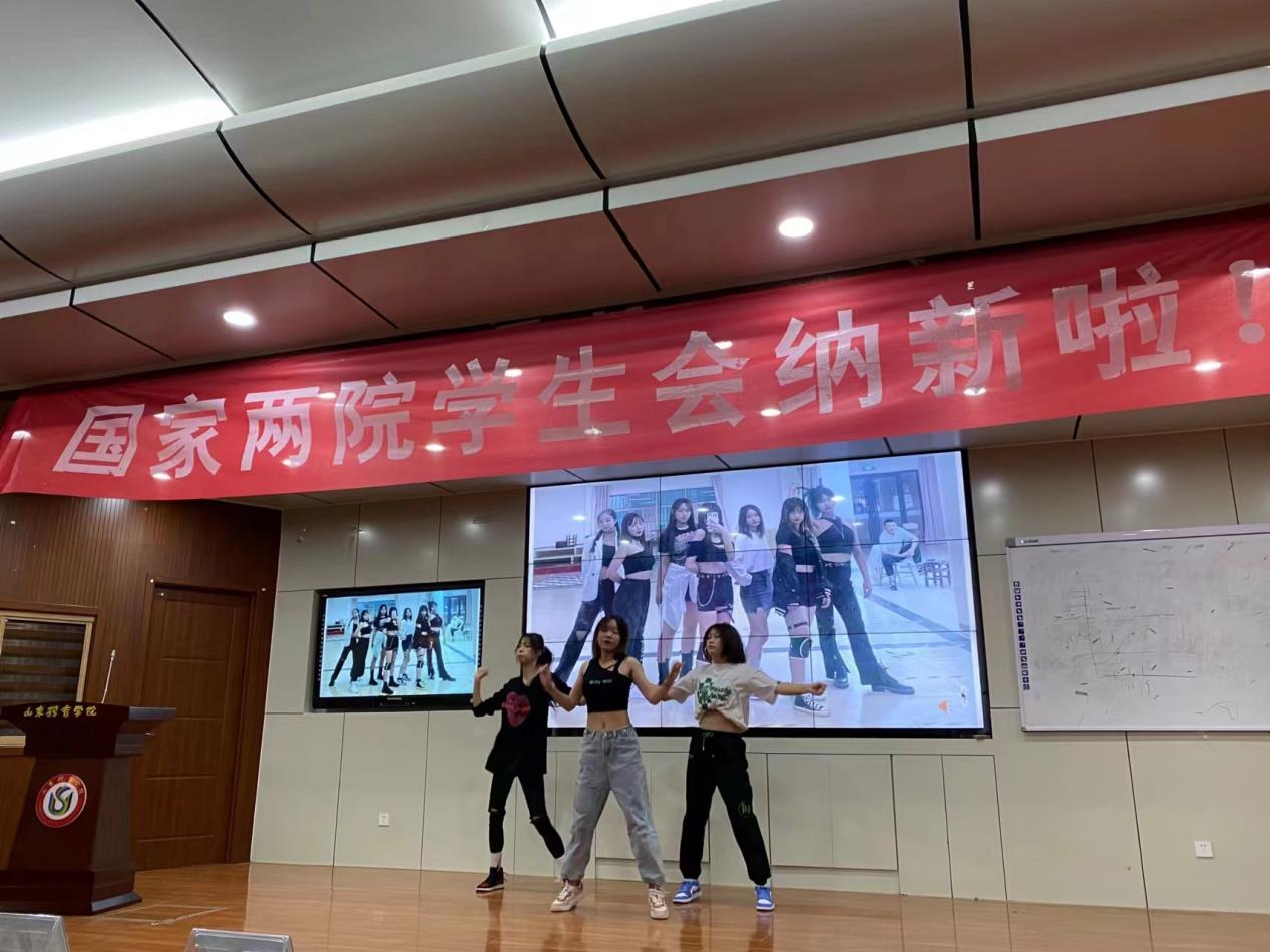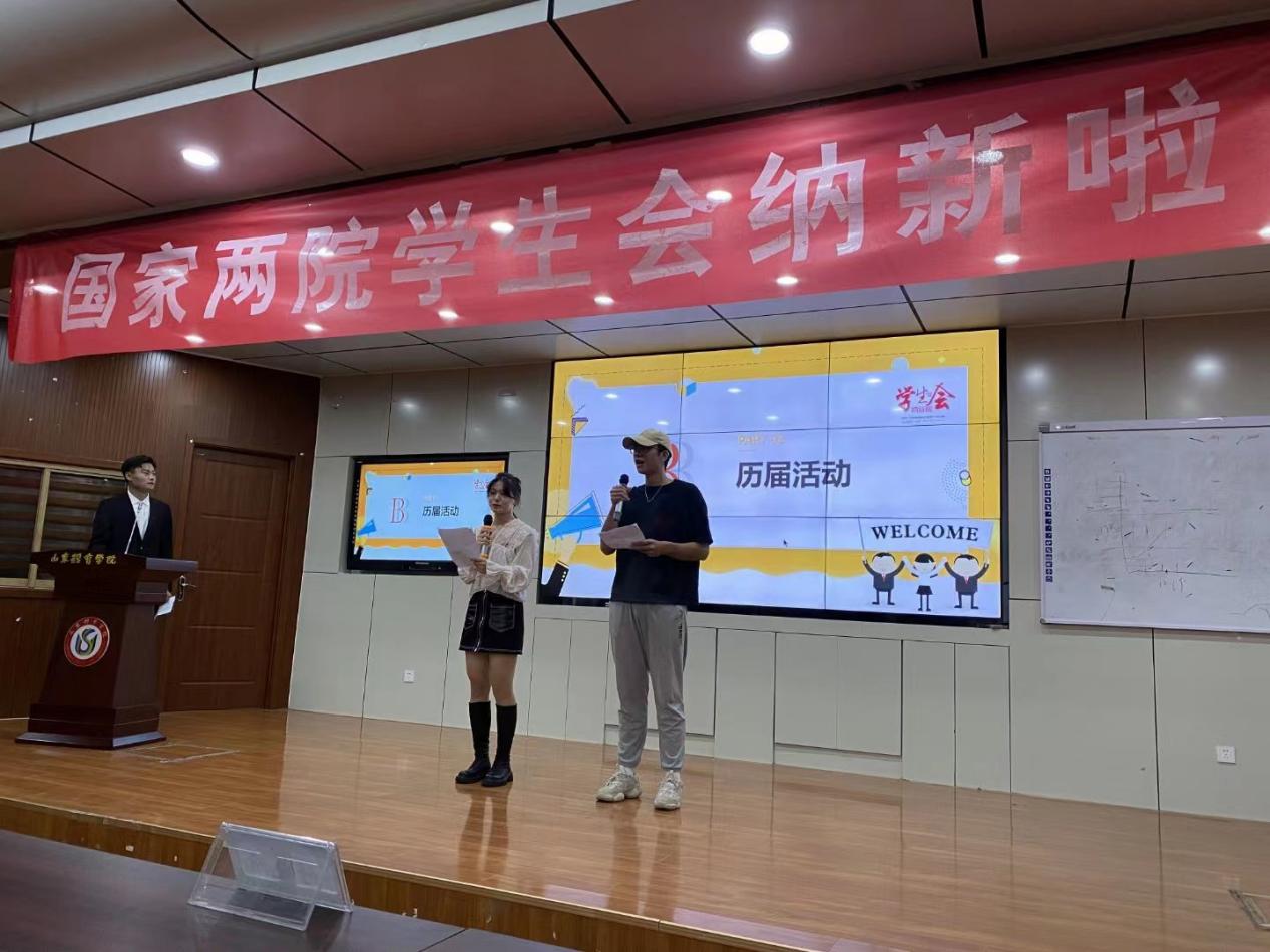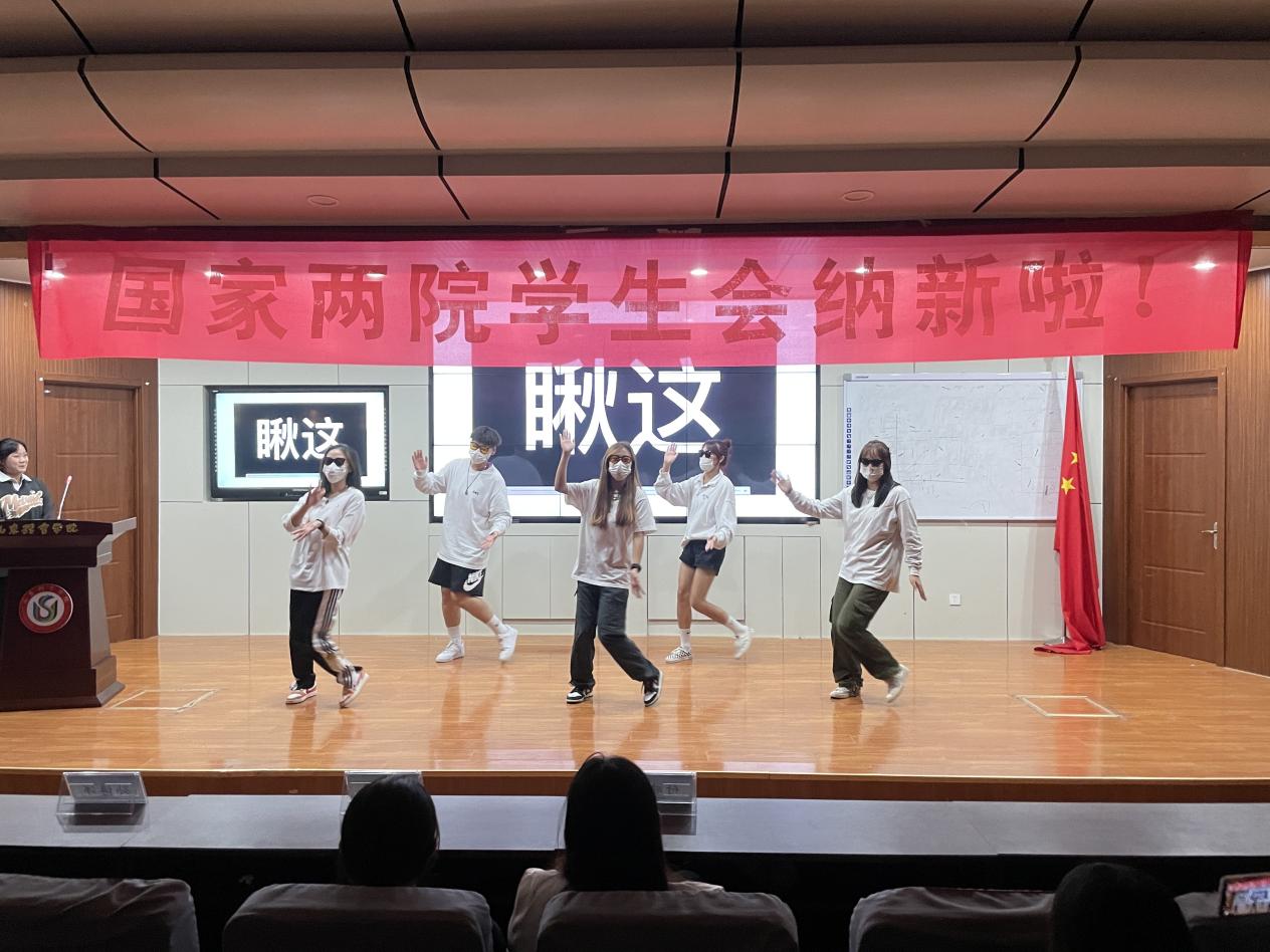国家两院学生会秘书处、文体部、学习部、女生部、外宣部代表上台发言,介绍各部门职责,作了上一年工作总结和新一年工作计划报告,让大一新生对学生会各部门有了进一步的认识和了解。活动还为新同学们准备了相声、歌舞等精彩的文娱表演,赢得了台下一片掌声与喝彩。