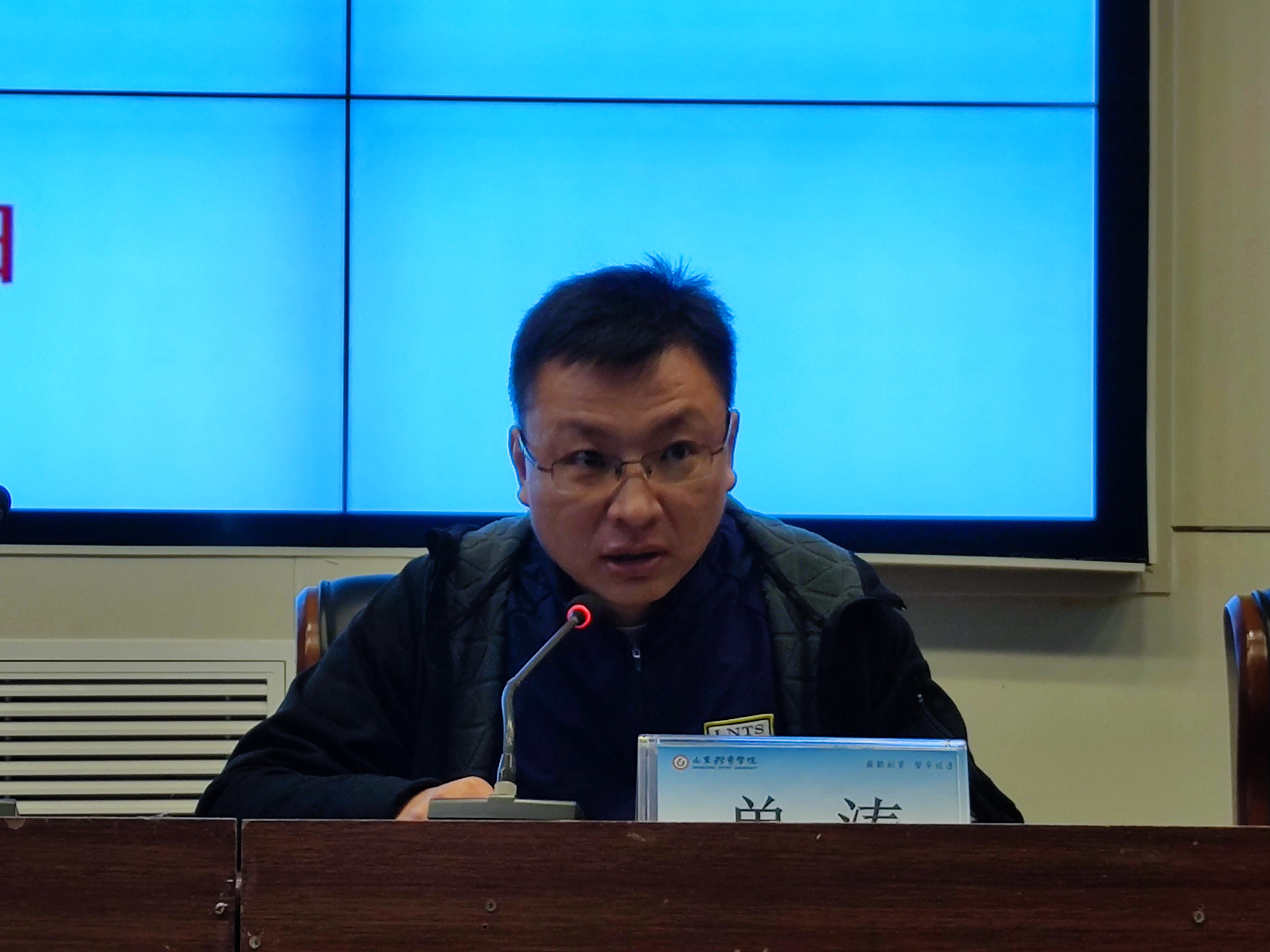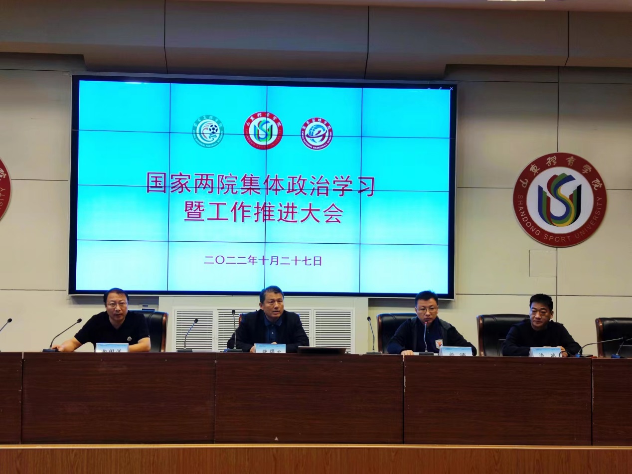 10月27日下午,国家足球学院国家篮球学院(以下简称“国家两院”)在综合教学楼报告厅召开全体教职工大会。山东体育学院党委委员、副院长,国家两院副院长(主持日常工作)张疆之,国家两院党总支书记单涛、副书记潘冰、业务部副主任曲国洋出席会议。大会由曲国洋主持。