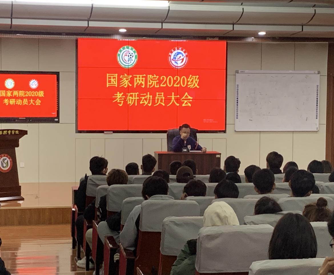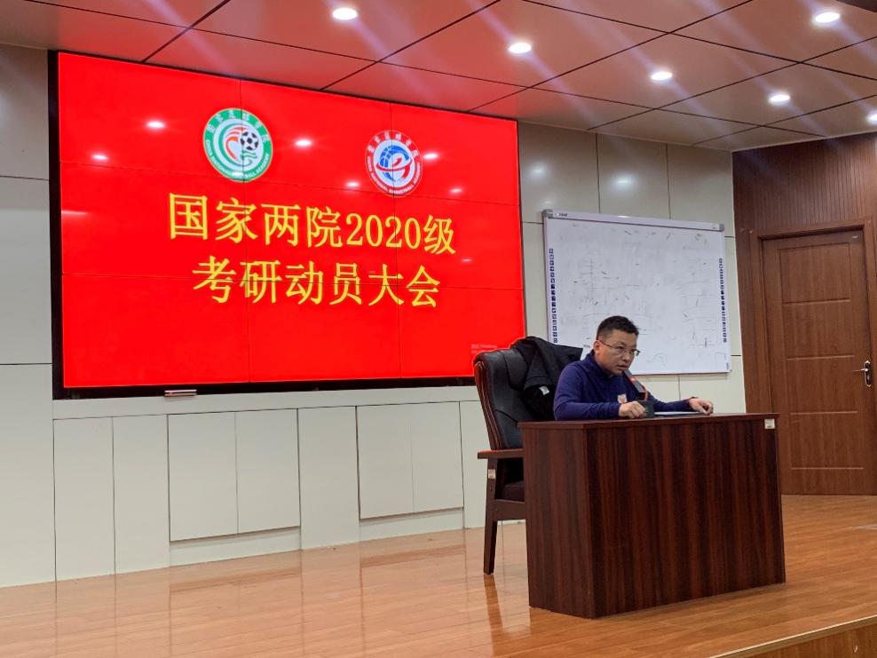 10月27日晚,国家足球学院国家篮球学院(以下简称“国家两院”)在培训楼报告厅举行2020级学生考研动员大会。学院党总支书记单涛、副书记潘冰、辅导员任帅钦及全体2020级学生参加会议。