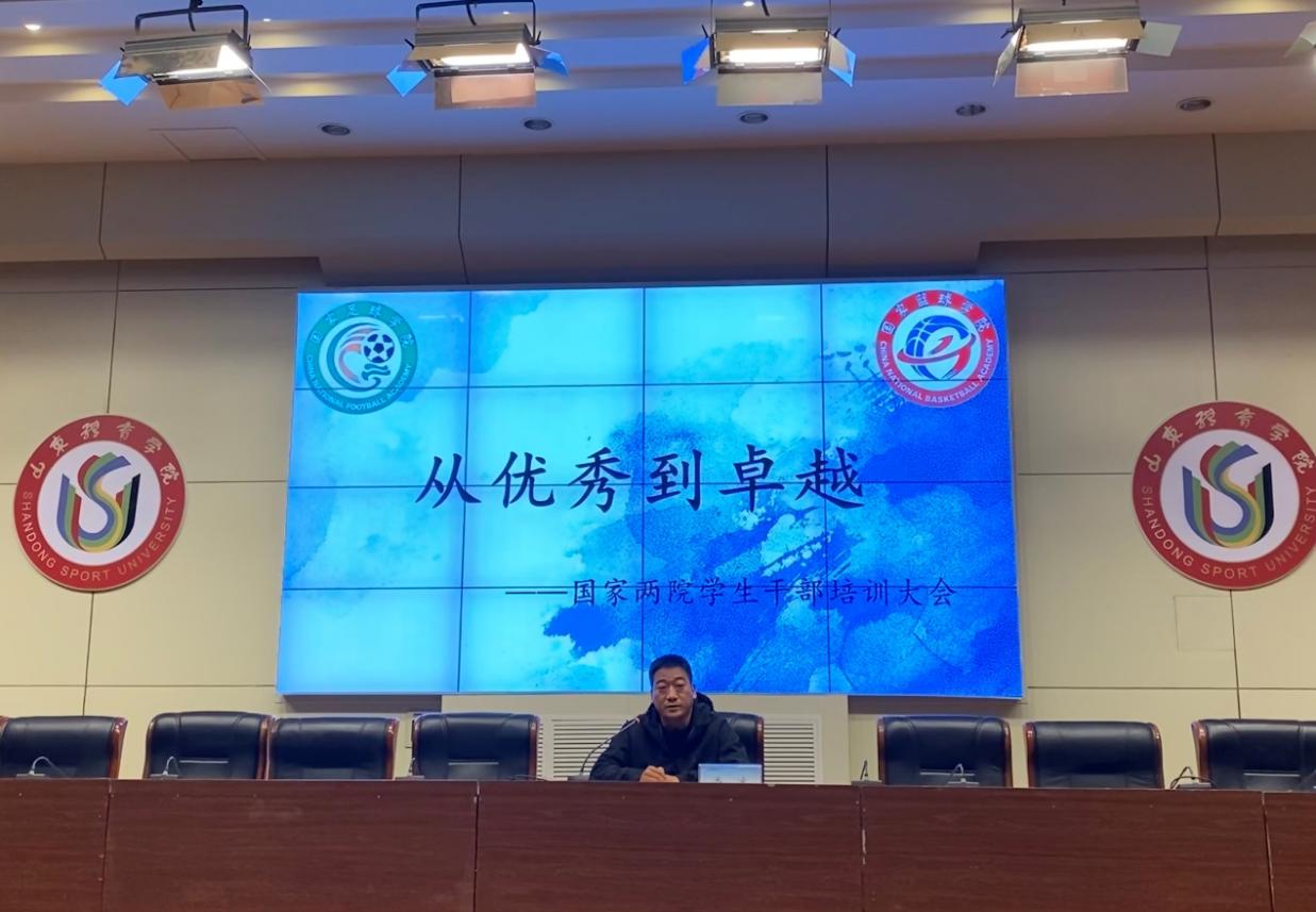 ? 11月23日晚,国家足球学院国家篮球学院(以下简称“国家两院”)在综合教学楼5楼报告厅举行国家两院学生干部培训大会。国家两院党总支副书记潘冰主讲,国家两院团总支副书记宋耀杰主持,国家两院全体学生干部参加本次大会。