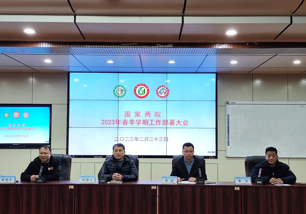 2月23日,国家足球学院国家篮球学院(以下简称“国家两院”)在培训楼报告厅召开2023年春季学期工作部署大会。山东体育学院党委委员、副院长、国家两院副院长(主持日常工作)张疆之,国家两院党总支书记单涛、副书记潘冰、业务部副部长曲国洋及国家两院全体教职工参加会议。会议由曲国洋主持。