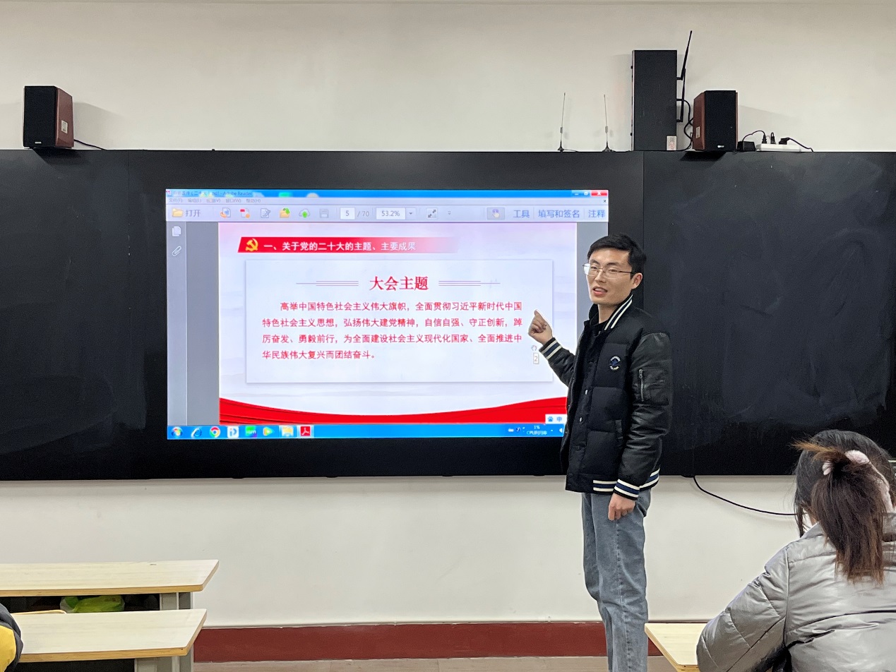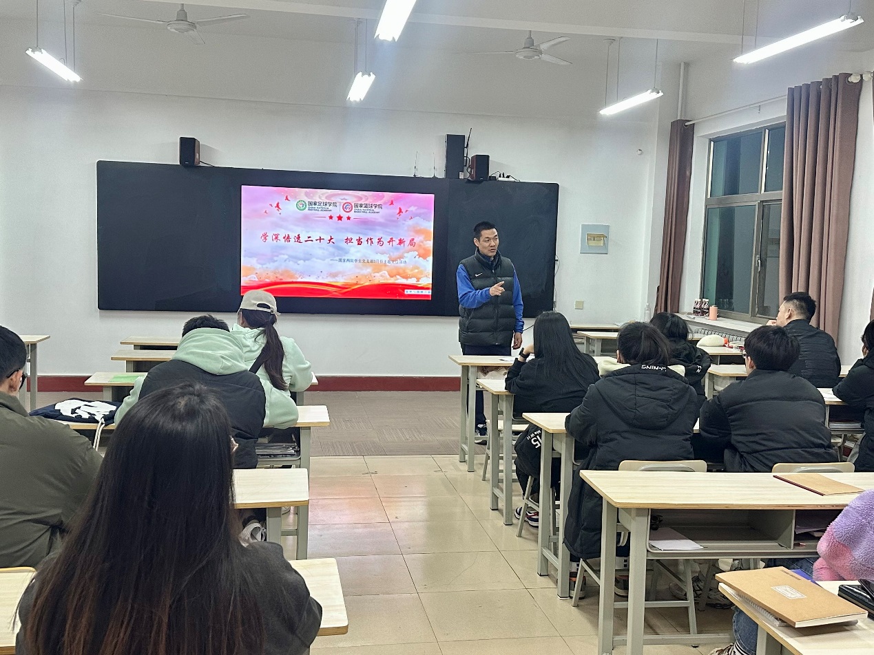 ? 为持续推动学校学习贯彻党的二十大精神主题宣讲活动见深度显热度,推进党的二十大精神落地生根、入脑入心、开花结果,根据学院二十大学习计划及相关工作安排,3月15日,国家足球学院国家篮球学院学生党支部在培训楼三楼318教室开展“学深悟透二十大,担当作为开新局”党的二十大报告专题学习主题党日活动,辅导员宋耀杰、朱鹏、刘海泽及全体学生党员参加,活动由支部书记任帅钦主持。