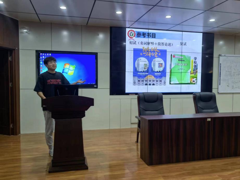 交流会上,五名准研究生从自身考研经历出发,围绕如何选取专业和院校,制定复习计划,调整复习心态以及复试中的注意事项等方面分享亲身经验和感受。高佳俊(考取北京体育大学)和廖丽雯(考取山东体育学院)同学向大家介绍了专业课备考学习方法。李世龙(考取南京体育学院)同学对考情做出分析,强调独立思考的重要性,选取专业和院校时不要盲从,从“勤奋”“计划”“心态”三个关键词总结自身成功经验。曹佳瑞(考取山东体育学院)同学从英语学习方面分享了高分经验。周翔(考取山东体育学院)同学向大家介绍了士兵计划和政治备考经验。