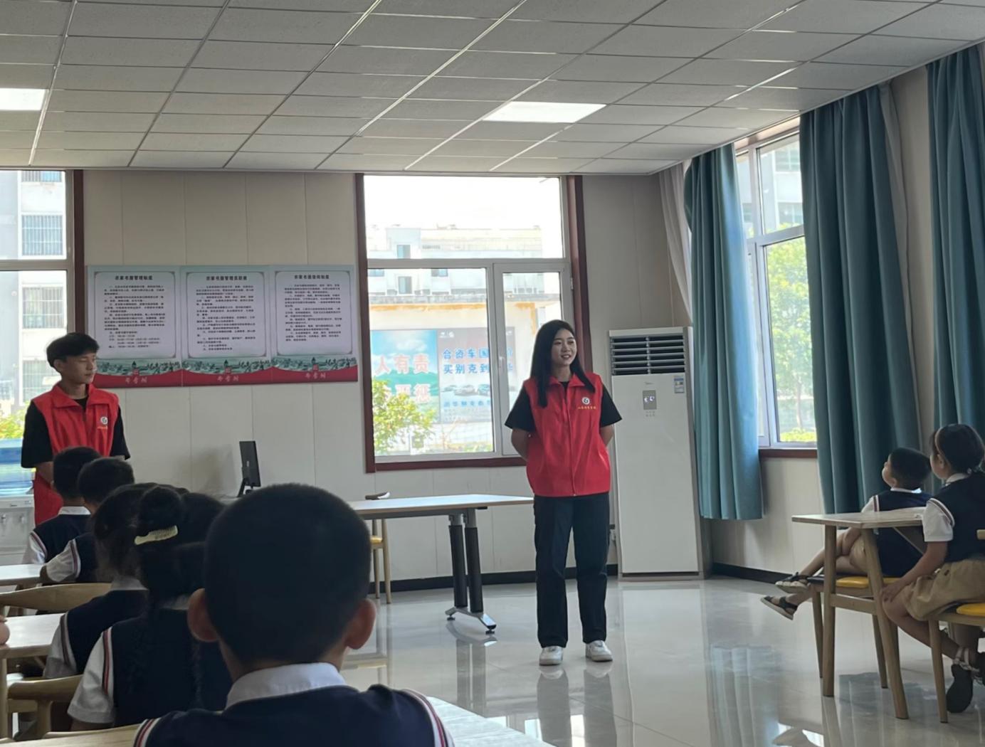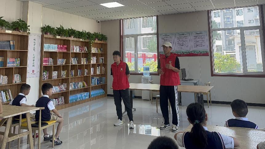 (图为“星火青春”志愿服务团成员王士勇为小二班的小朋友们讲解夏季防溺水知识)